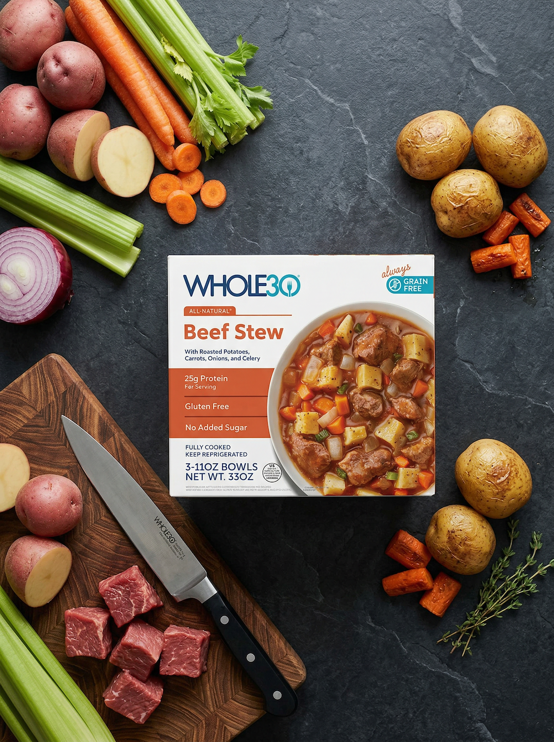 Beef Stew Broth (Water, Onions, Carrots, Celery, Tomato Paste, Beef Stock Concentrate, Extra Virgin Olive Oil, Arrowroot Powder, Sea Salt, Garlic, Black Pepper, Bay Leaf) Beef Chuck, Roasted Potatoes (Russet Potatoes, Extra Virgin Olive Oil, Sea Salt).